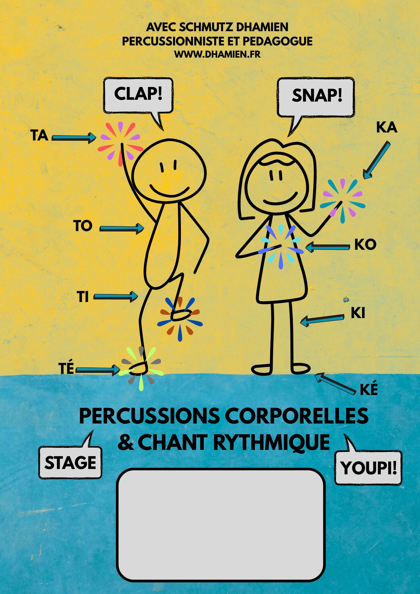 Les percussions corporelles permettent une découverte globale des musiques de notre monde (Brésil, Afrique, orient…), de styles musicaux (funk, Hip Hop, rock…) et des résonances de notre corps dans des compositions collectives. Ne nécessitant ni une technique débordante ni un équipement particulier, elles sont naturellement abordables par tous.